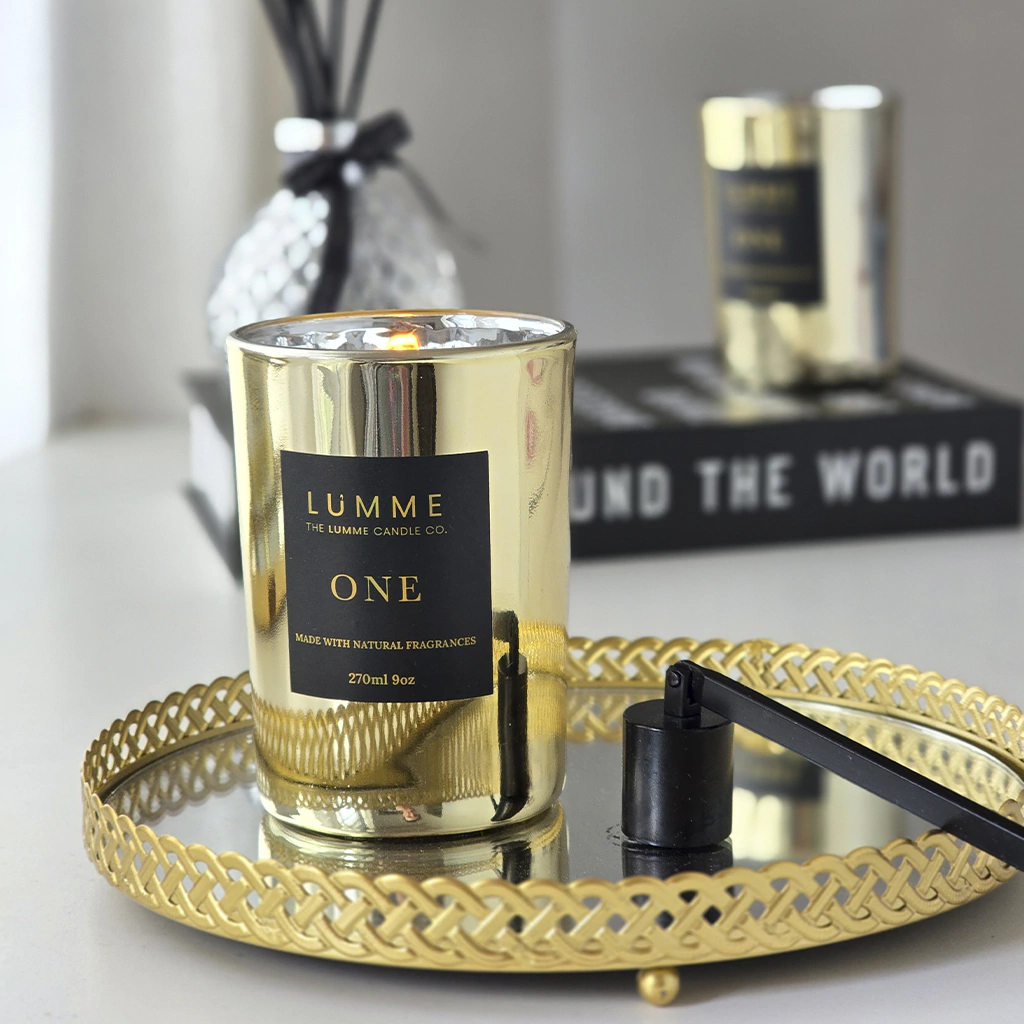 Vela 100% de soja, presentada en un sofisticado vaso de vidrio dorado espejo, que refleja la luz con un brillo cálido y contemporáneo.