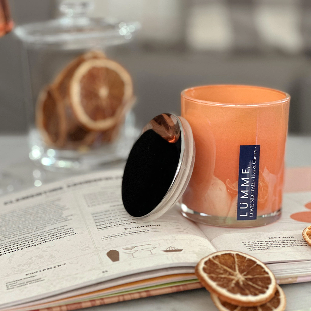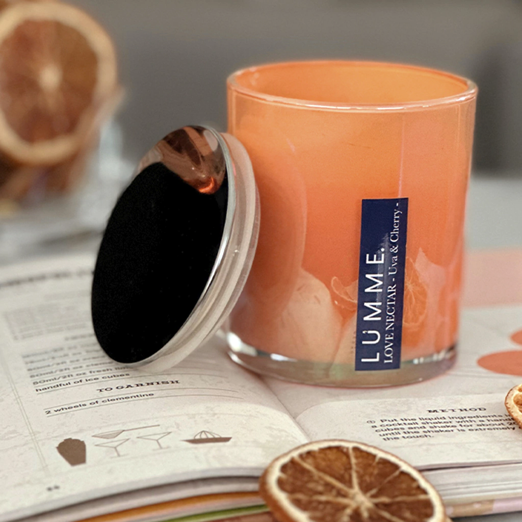 Vela en vidrio holográfico tornasol con reflejos en tonos naranja, que cambia sutilmente según la luz.